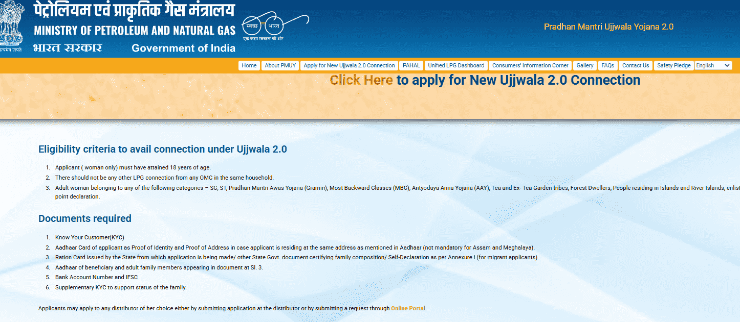 प्रधानमंत्री उज्जवला योजना 2.0 में आवेदन करने के लिए आपको:- आधिकारिक वेबसाइट पर जाएं